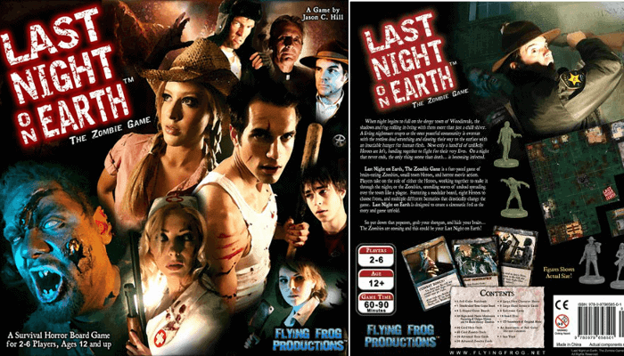 Last Night on Earth is a Zombie Game designed by Jason C Hill, artwork by Jack Scott Hill and produced by Flying Frog Productions. The game is designed for 2 – 6 players and takes approximately 60 -90 minutes to complete.